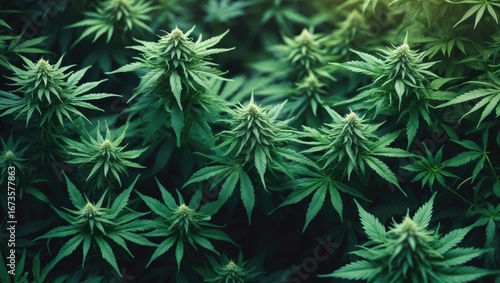 Grow of cannabis plants with broad green leaves and flowering tops. Cannabis cultivation, medicinal and recreational use, and plant growth. The concept of cannabis cultivation.