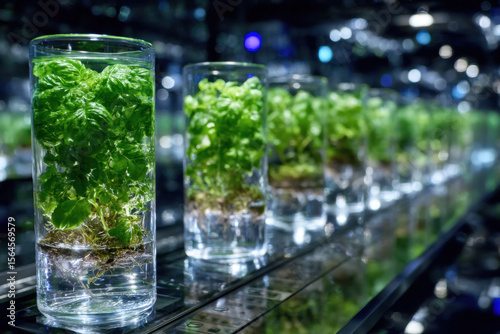 Growing herbs in clear glass containers in a modern indoor garden setup