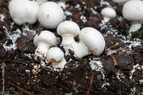 Growing of white champignons mushrooms, mycelium grow from compost into casing on organic farm in Netherlands, food industry in Europe