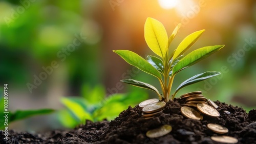 Growing plant with coins, symbolizing financial growth and sustainability.