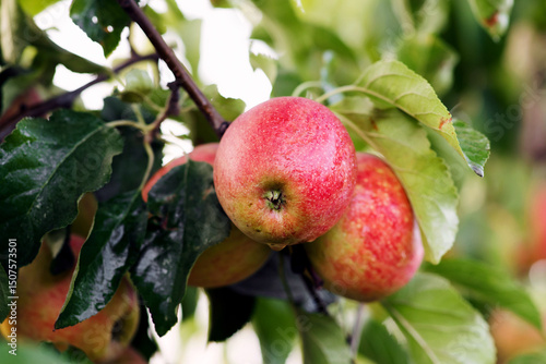 Growing plants for business, trade and industry. Red apples on tree, fresh fruits in organic plantation at autumn. Ripe harvest with green leaves on branch on eco farm, outdoor, copy space, mockup