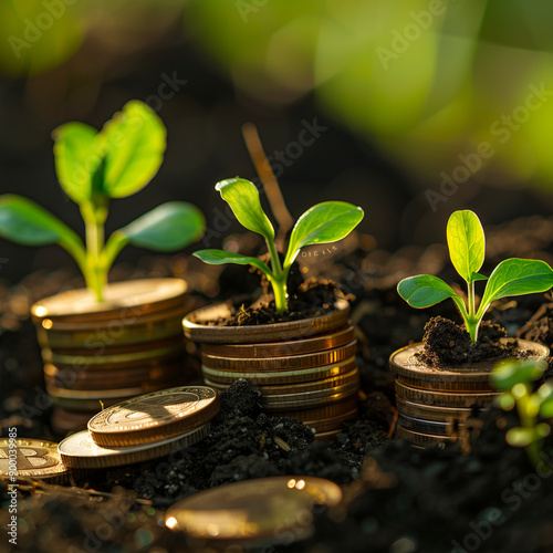 Growing Plants on Coins in Soil Depicting Investment and Financial Growth