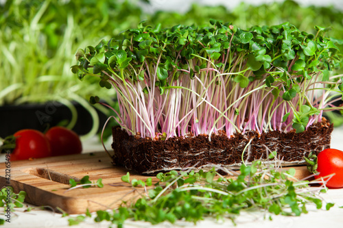 Growing sprouted seeds, microgreens. Healthy lifestyle. Green sprouts in a block of soil
