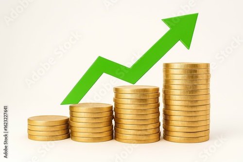 Growing stacks of gold coins with a green upward trending arrow symbolizing financial growth