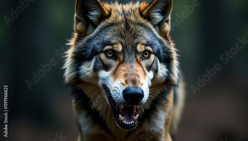 Growling large gray wolf face close-up snarling at camera, snarling, aggressive
