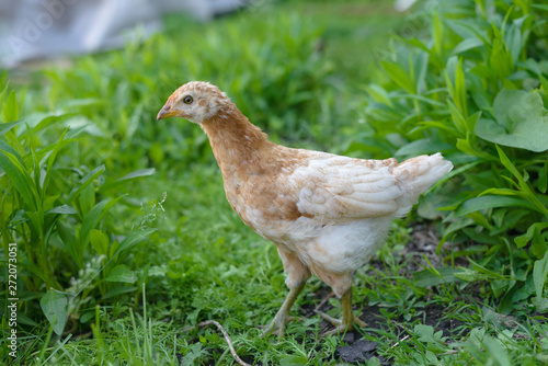 Grown brown chick on the farm look carefully at the camera on nature background.