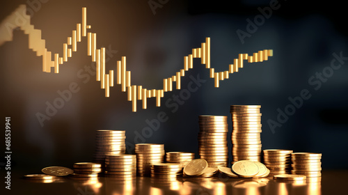 Growth arrow gold coin currency price on money business finance 3d background with success financial market investment earning graph or economy concept cash profit chart and increase stock up symbol