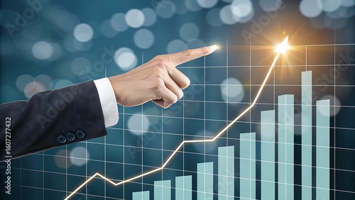 Growth Chart with Ascending Arrow and Hand, Representing Advancement, Progress, and Positive Development on a Bokeh Background.