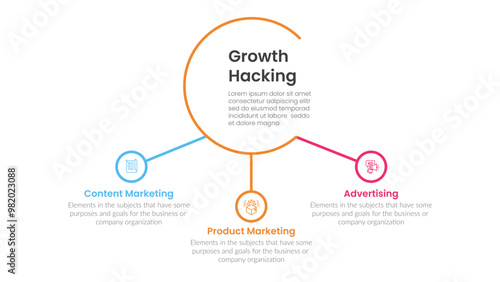 growth hacking infographic 3 point with big circle and small circle linked for slide presentation