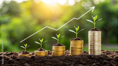 Growth shown in stacked coins with plants and upward trending arrow on blurred background representing investments and positive outcomes