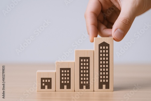 Growth Strategy Concept: Hand Arranging Wooden Blocks Depicting Gradual Expansion of a Business or Real Estate Portfolio
