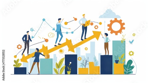 Growth strategy, team businessman collaboration to grow business success, teamwork or partnership to develop or improve work efficiency concept, businessman employee team help grow rising arrow chart.