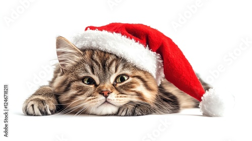 Grumpy cat in a Santa hat lying on a white background, looking displeased