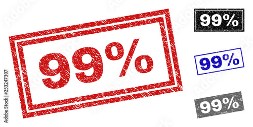 Grunge 99% rectangle stamp seals isolated on a white background. Rectangular seals with grunge texture in red, blue, black and gray colors. Vector rubber imprint of 99% text inside rectangle borders.