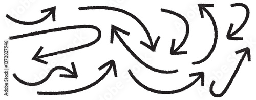 Grunge arrow vector set. Grunge arrow brush drawn. set of chalk pencil, brush stroke arrows. various charcoal arrows. Hand drawn doodle arrow symbols vector.