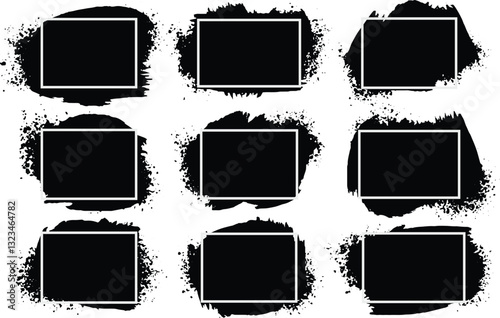 Grunge backgrounds set. Brush black paint ink stroke over square frame. Vector illustration