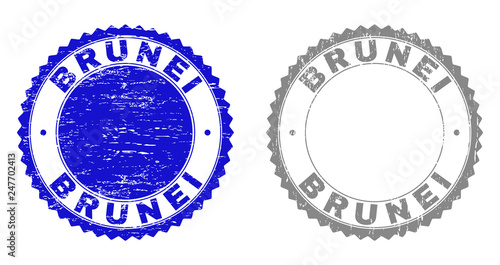 Grunge BRUNEI stamp seals isolated on a white background. Rosette seals with distress texture in blue and gray colors. Vector rubber overlay of BRUNEI text inside round rosette.