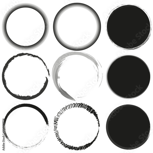 Grunge circle frames set. Black and white vector borders. Various design styles.