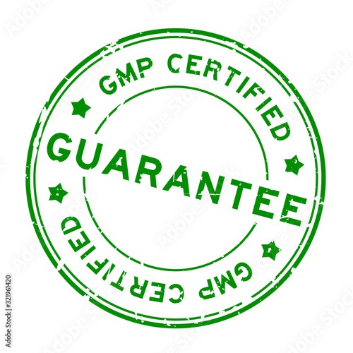 Grunge green GMP (Good manufacturing practice) certified guarantee word round rubber seal stamp on white background