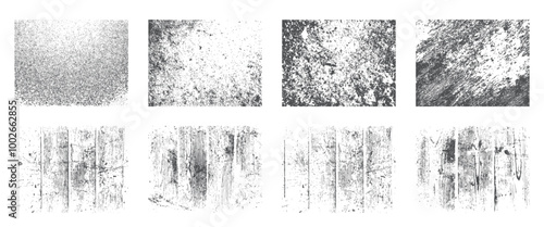 Grunge noise and wooden boards texture set. Isolated vector patterns on white background