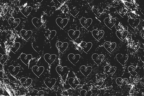 Grunge pattern with line art icons of hearts. Horizontal black and white backdrop.