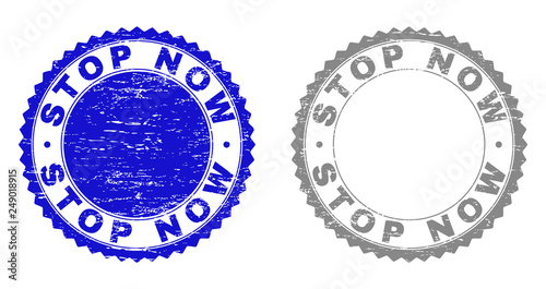 Grunge STOP NOW stamp seals isolated on a white background. Rosette seals with distress texture in blue and gray colors. Vector rubber stamp imprint of STOP NOW text inside round rosette.