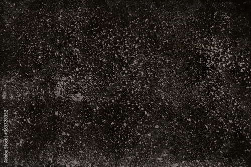 Grunge surface texture with splashes, dots, grit and noise. A texture with random gray dots on a black background, similar to the starry sky, space.