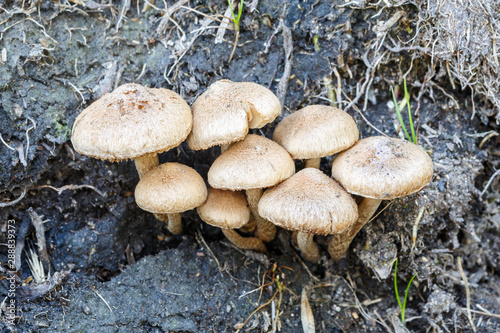 Grupo de setas lacrimaria aterciopelada en el borde de un sendero a finales del verano. Psathyrella lacrymabunda.