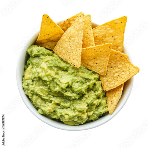 guacamole served with tortilla chips in a white bowl. isolated on transparent background.