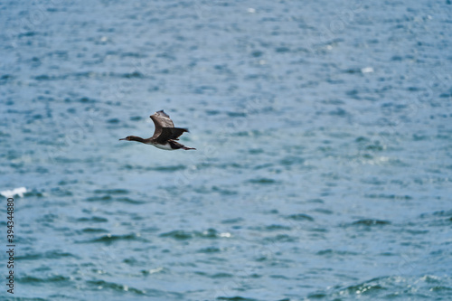 guano cormorant in flight at Paracas national park at the Pacific Ocean coast line of Peru. Guanay cormorant or Guanay shag, Leucocarbo bougainvillii, soaring over pacific ocean