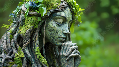 Guardian of nature. statue of a woman covered in green moss, plants and roots in the wood - nymph, dryad, fairy, mystical myth and legend, spirit of the forest. Forest Dryad. Illustration