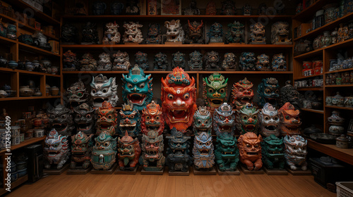 Guardians of Tradition: A captivating collection of intricately carved Asian Foo Dogs, displayed in a dimly lit room, creates an atmosphere of mystery and cultural heritage.