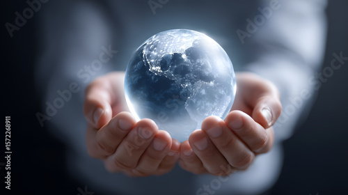Guarding the Earth: A pair of gentle hands cradling a luminous, shimmering globe, symbolizing the delicate nature of our planet and the importance of environmental stewardship.