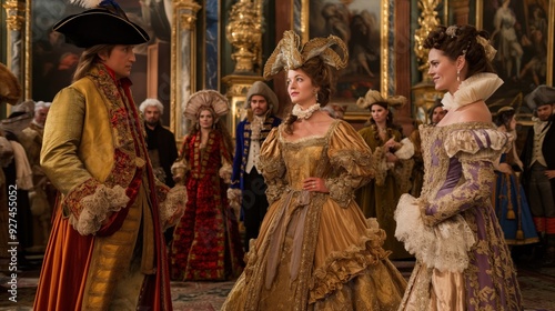 Guests adorned in lavish historical costumes engage in conversation at a majestic palace during an extravagant ball, exuding an atmosphere of opulence and sophistication