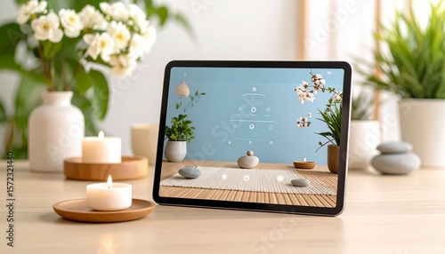 Guided meditation app screen mockup displayed on a tablet, clean and minimal user interface with soothing icons and soft typography, placed against a gentle nature-inspired background with pastel tone