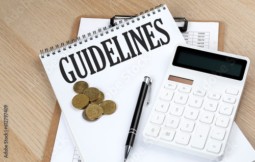 GUIDELINES text on a notebook with chart and calculator and coins, business concept