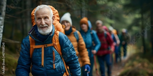 Guiding a Forest Hike for Adventurers Elderly Guide Leads Group on Trail. Concept Outdoor Adventures, Guided Hike, Nature Exploration, Senior Guide, Trail Walking