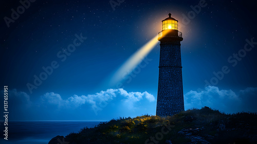 Guiding light beacon illuminates night sky. Towering stone structure, shining beam, starlit dark sky, tranquil ocean