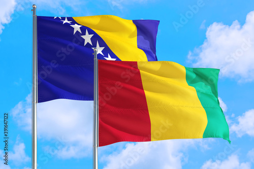 Guinea Bissau and Bosnia Herzegovina national flag waving in the windy deep blue sky. Diplomacy and international relations concept.
