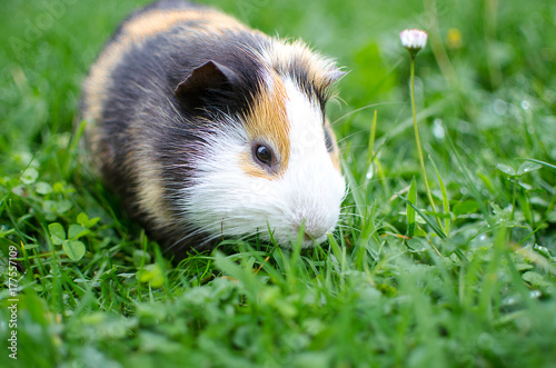 guinea pig walks in the fresh air and eating