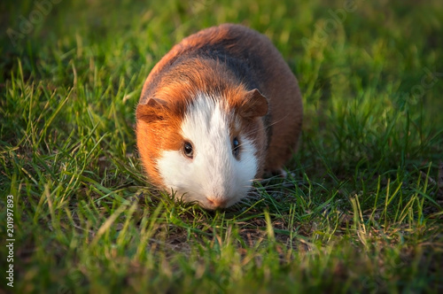 guinea pig walks in the fresh air and eating green grass