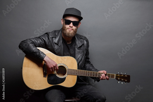 Guitar player singing in music studio. Hipster guitar player with beard and black clothes playing the acoustic guitar