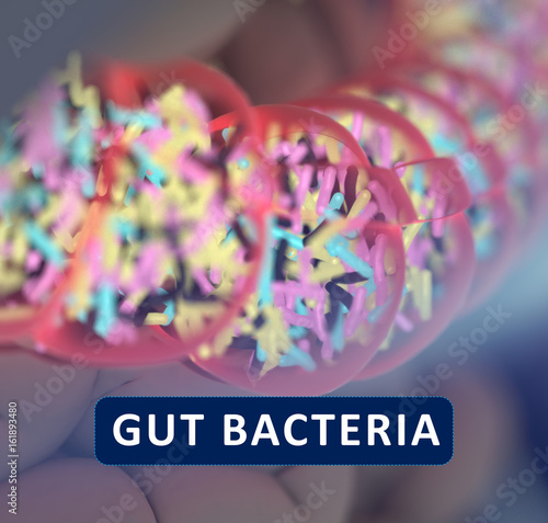 Gut bacteria, microbiome. Bacteria inside the large intestine, concept, representation. 3D illustration.