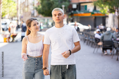 Guy and girl are walking along pedestrian street, having nice time, heading to cafe to meet friends. Young people spend time together, enjoy each others company..
