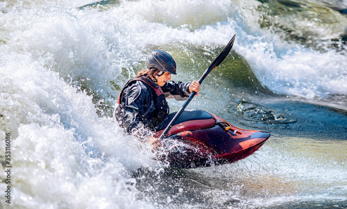 Guy in kayak sails mountain river. Whitewater kayaking, extreme sport rafting