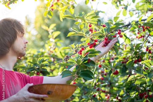 guy tears ripe red cherries from the tree to the basket. Cherry Harvest