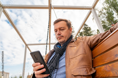 Guy texting on mobile phone in park. Happy millennial man outdoors using mobile phone in recreation area. Young caucasian man relax on wooden swinging bench in autumn park outdoors. Life-work balance