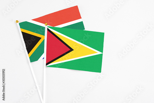 Guyana and South Africa stick flags on white background. High quality fabric, miniature national flag. Peaceful global concept.White floor for copy space.