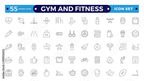 Gym and fitness icon set. Containing healthy lifestyle, weight training, body care, and workout or exercise equipment icons. Editable stroke outline icon.