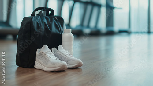 Gym Floor Closeup with Black Sport Bag, Athletic Shoes, and Protein Shake or Water Bottles - Indoor Fitness Equipment and Accessories for Sporty Activity Photo